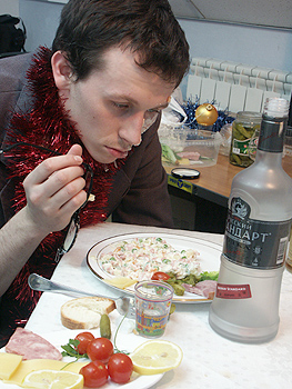 Учитывая, что соблазнов на столе будет выше крыши, необходимо проявить сообразительность и предусмотрительность и отжалеть в личное пользование банку солений. Делать это надо стремительно и безжалостно, не давая окружающим сообразить, куда вы тянете огурцы и зачем их прячете. Всякая маринованная бестолочь из супермаркета не годитсяP только наши родные огурцы и помидоры домашнего засола. Точно так же смело и быстро надо запихнуть в дальний угол холодильника заначку из стакана водки. И без эквилибристики, плиз. Похмеляться надо белой, дорогой, холодной и чистой как слеза. Неправильное опохмелениеP путь к алкоголизму, пивом с утра пусть отпиваются враги. Впрочем, до пива тоже дойдет очередьP после беленькой